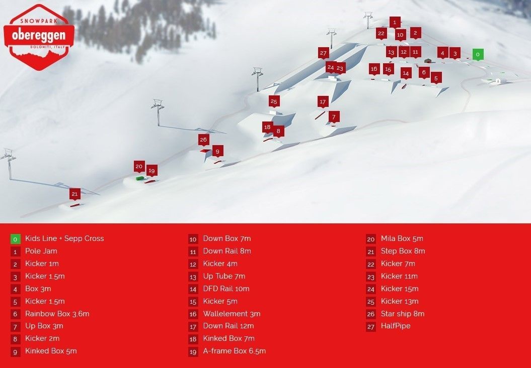 Skidområdet Latemar - Obereggen/Pampeago/Predazzo är ett riktigt paradis för ambitiösa vintersportentusiaster. Med ett fascinerande panorama och många soliga dagar kan du njuta av idealiska förhållanden för att varva ner eller verkligen släppa loss ångan. Det finns också stora möjligheter för freestylers bland er att öva på nya hopp. "Latemar Snowpark" ligger på pisten. Olika boxar, kickers och lines samt rails väntar på dig och är lämpliga för alla åknivåer.